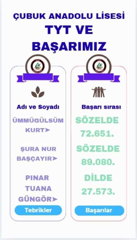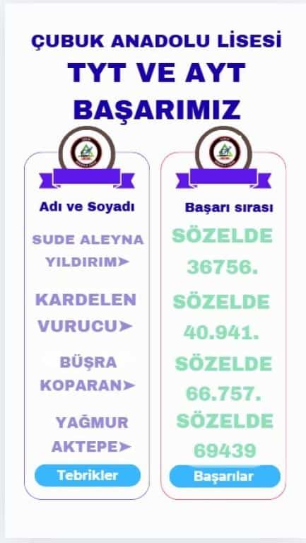 2025 YKS Başarımız... (S. DEMİRKAZMA SAYISALDA 17.163. , K. VURUCU SÖZELDE 40941., S. A. YILDIRIM SÖZELDE 36.756., Ü.KURT SÖZELDE 72.651., P. T. GÜNGÖR DİLDE 27.573.) Tüm öğrencilerimizi canı gönülden kutluyoruz.